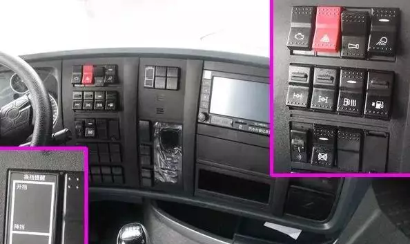 偏向于駕駛員一側(cè)的儀表臺(tái)控制功能也穩(wěn)中有升,增加了燈光高度調(diào)節(jié)、換擋提醒等功能,通過控制按鈕也能看得出此車配備了雙油箱,并集成了油箱加熱和主副油箱切換的功能。不管是乘用車還是商用車,高度電氣化是廠家和用戶的共識(shí)。